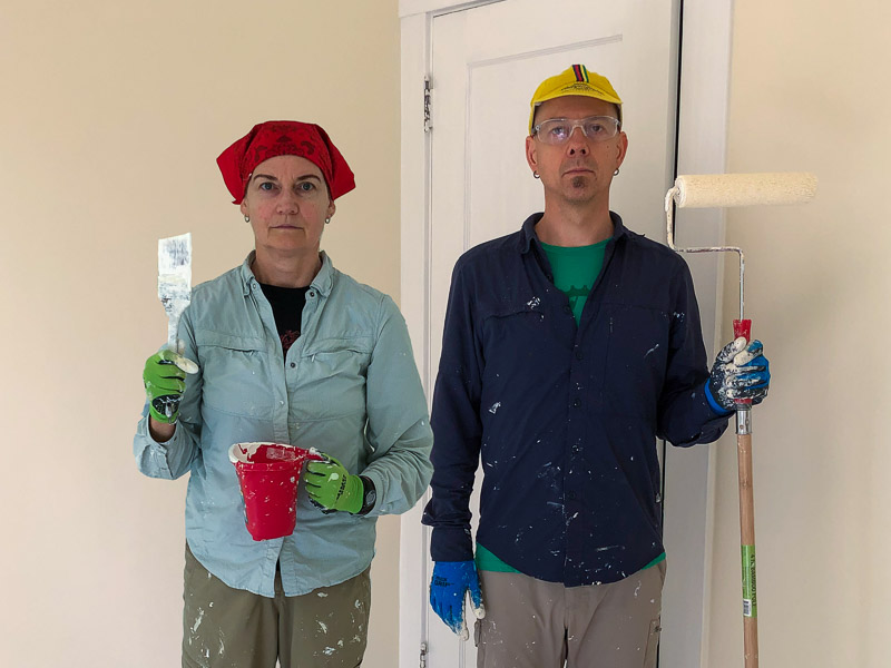 One of our trim details is a picture rail (above), which can be used to hang pictures by wire rather than needing to put nails into the walls. Kristina was painting the second coat on the picture rail when Pete snapped this selfie. Slowly our house was starting to look good again, and we felt grateful that we were able to be here during the pandemic.